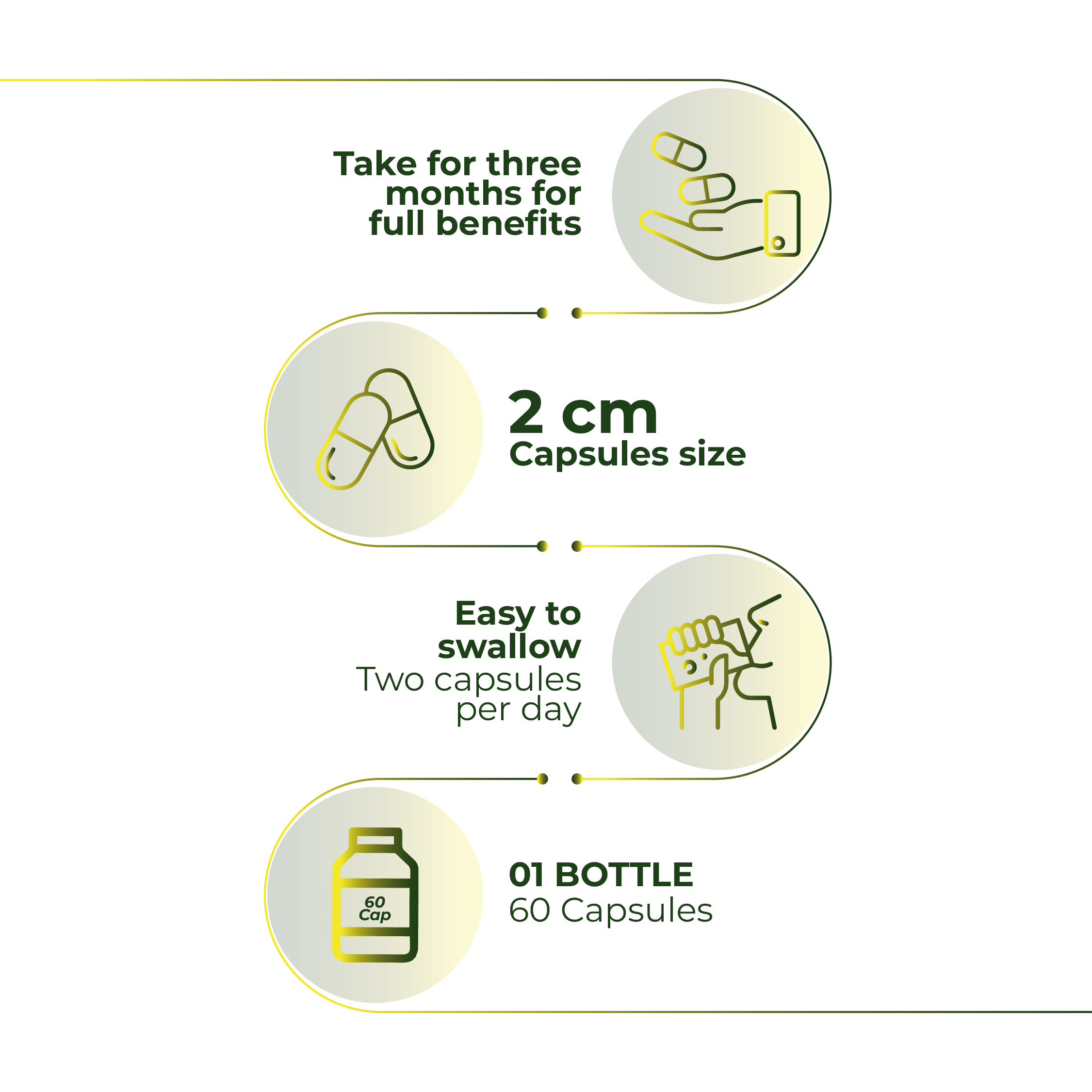 Tomar 2 cápsulas con la comida, como complemento nutricional para adultos o según prescripción médica (HACER TRATAMIENTO DURANTE 3 MESES). No exceder la dosis sugerida sin consultar antes a un profesional de la salud.
