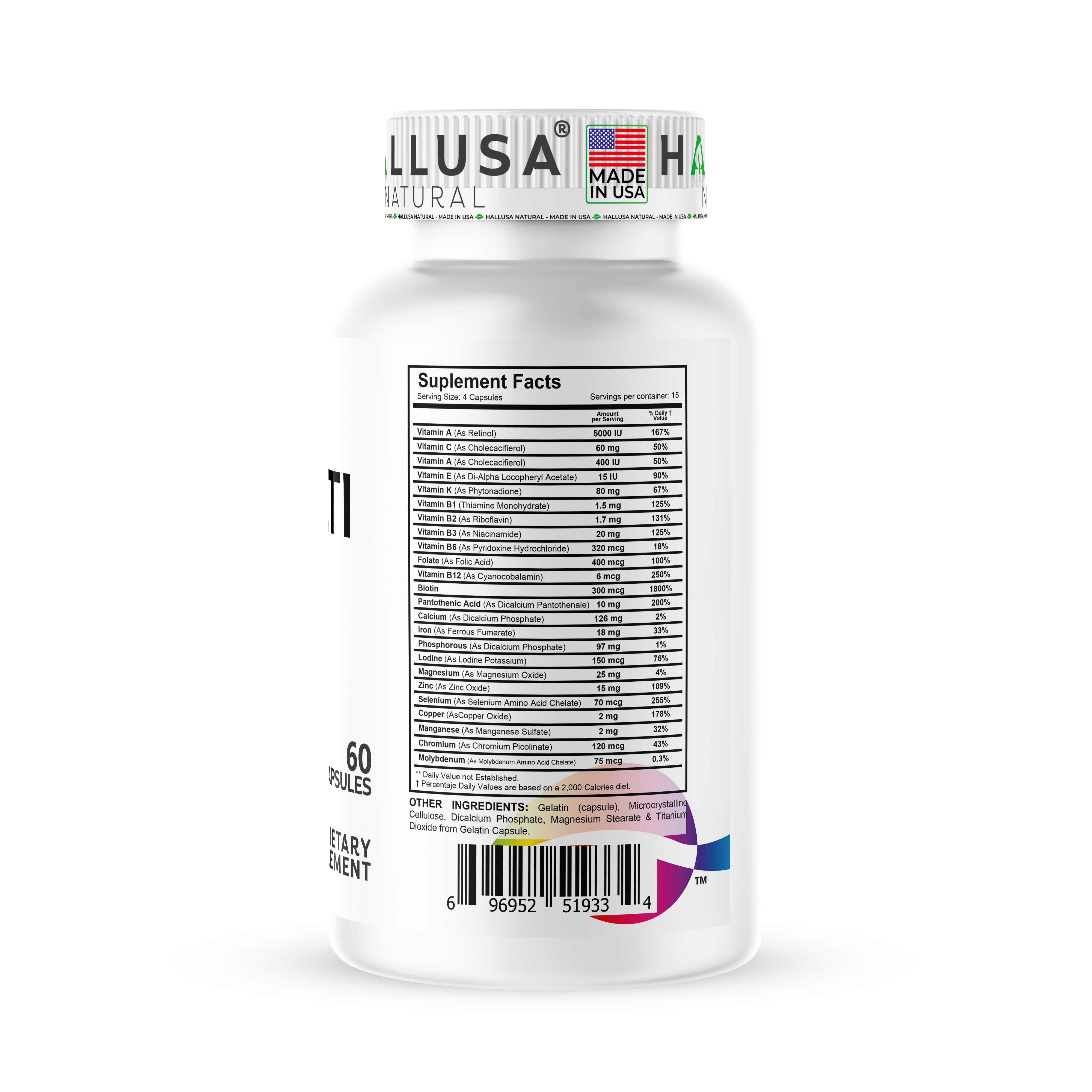 Vitamina A, Vitamina C, Vitamina D, Vitamina E, Vitamina K, Vitamina B1, Vitamina B2, Vitamina B3, Vitamina B6, Folato, Vitamina B12, Biotina, Ácido Pantoténico, Calcio, Hierro, Fósforo, Yodo, Magnesio, Zinc, Selenio, Cobre, Manganaso, Cromo, Molibdeno, Boro.